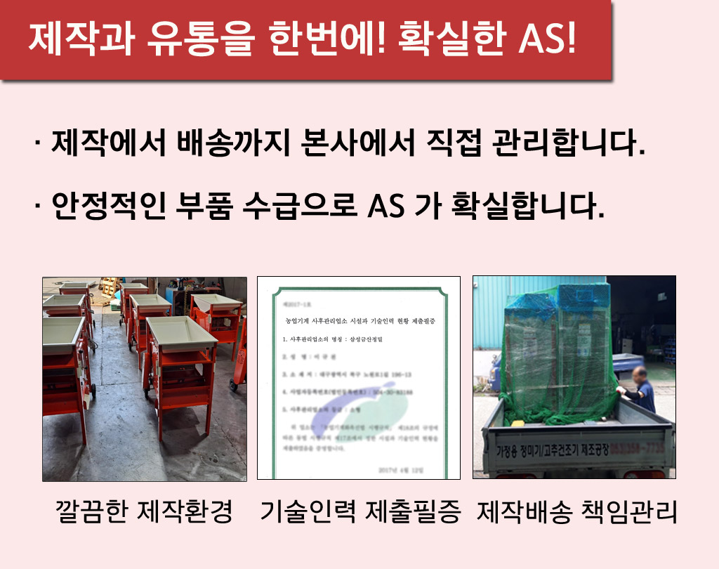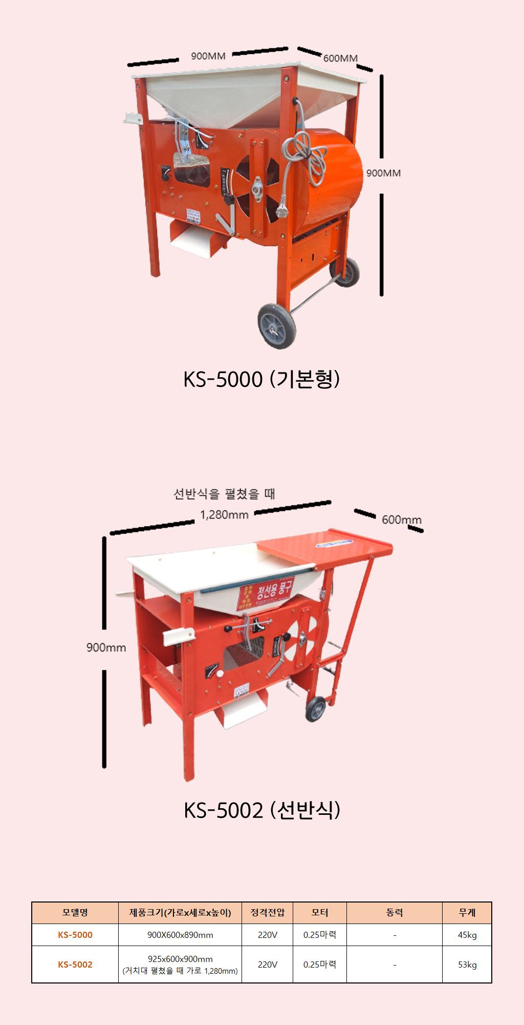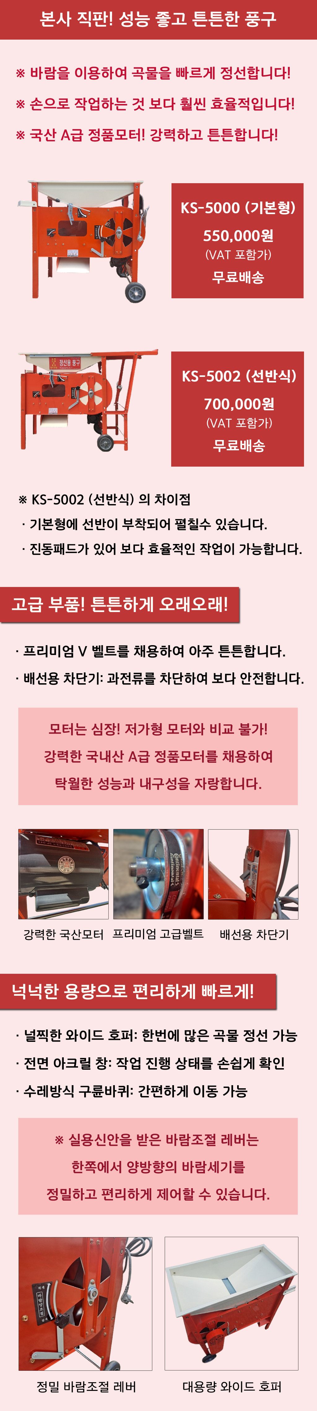 삼성금산정밀은 40년 전통의 기술력으로 신뢰받는 가정용 농기계 전문 기업입니다. 고추 건조기, 고추 세척기, 풍구, 콩탈곡기, 정미기 등 성능좋고 튼튼한 농기계를 전문적으로 제작 판매하고 있습니다. [풍구 카탈로그] 모델명 제품크기(가로x세로x높이) 정격전압 모터 무게 KS-5000 900X600x890mm 220V 0.25마력 45kg KS-5002 925x600x900mm 220V 0.25마력 53kg